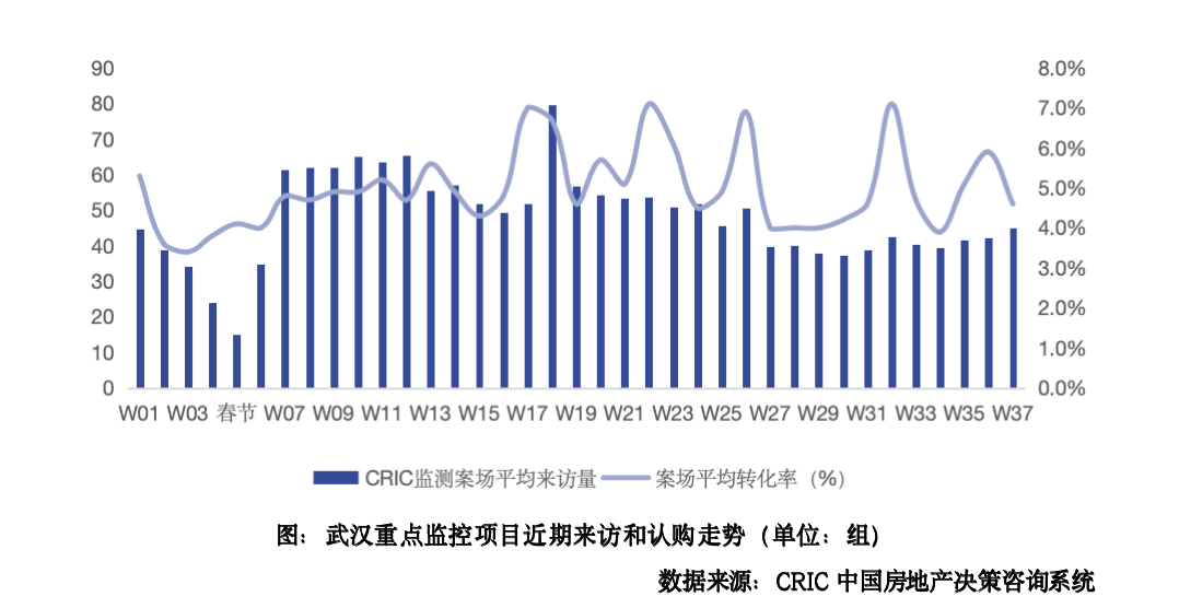 而武汉步入9月以来,红盘推新带动市场热度上涨,周度案均来访环比上涨、转化率小幅回落。第37周单盘平均来访45组,环比上涨6.1%,较8月周均上涨9.7%;单盘平均认购2.1套,环比下滑16%,较8月周均下滑2.3%,转化率4.6%环比回落1.3pcts。