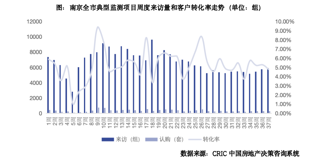 南京虽然来访量持增,而有效客户量略显不足,因而客户转化率也呈现出稳中有降行情,据CRIC监测重点项目显示,第37周(9.8-9.14)全市典型监测项目来访量环比上涨3%,认购量环比下降7%,转化率由5.29%,降至4.78%,整体市场热度延续波动趋势。