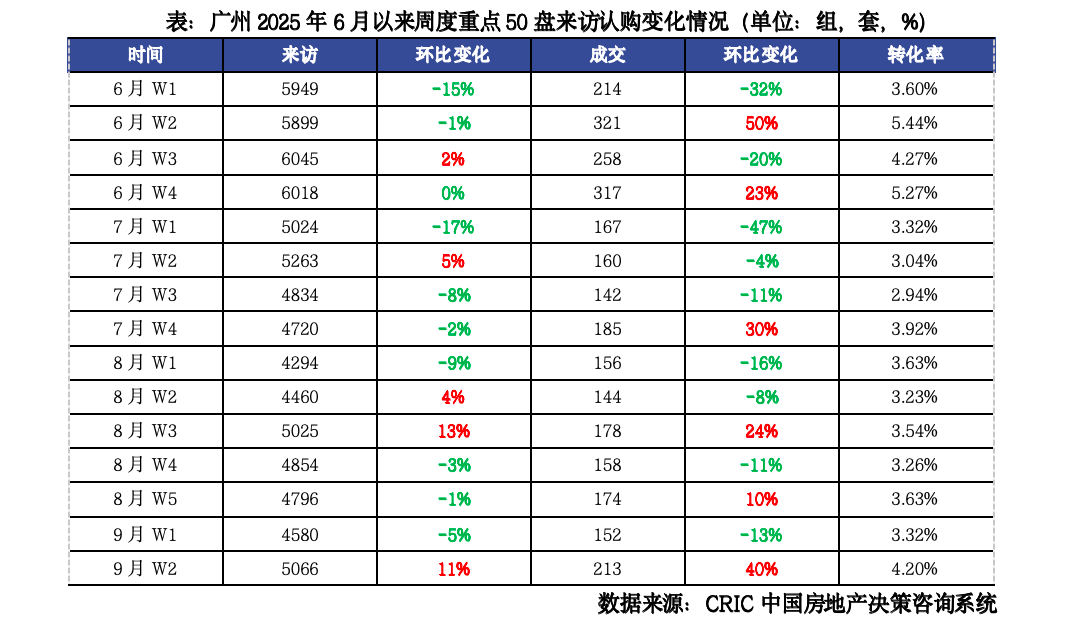 广州、天津、武汉等因热盘集中入市带动9月市场稳步复苏,客户转化率持增。以广州为例,步入9月以来,第一周来访、认购大幅回调,环比分别下降5%和13%,客户转化率由8月末3.63%降至3.32%,而第二周来访量止跌,环比回升11%,认购量大幅上涨40%,客户转化率增至4.2%。