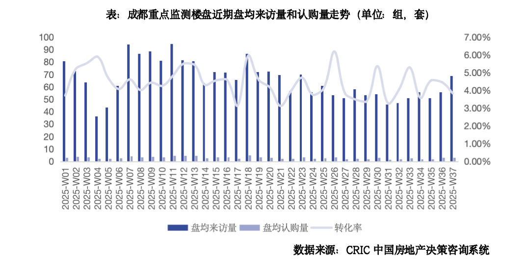 从成都重点项目近期来访和认购走势来看,整体市场热度较8月还是有了小幅回升,据CRIC监测数据,2025年9月前2周盘均来访量为63组,环比8月全月周均上升22%;盘均认购量为3套,环比8月全月周均上升40%;客户转化率达4.8%,环比8月全月周均上升0.6pcts。新房案场活跃度持续提升,预期也将在9月成交端有所体现。
