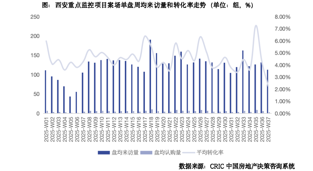 以西安为例,9月整体客户转化率高位回落,一降再降,迎来阶段性瓶颈。据CRIC监测数据,2025年第36周(9.1-9.7)盘均来访量为132组,而盘均认购量高达6套,第37周(9.8-9.14)来访量和认购量分别降至113组和3套,致使客户转化率降至2.25%,已达到近一年最低点。