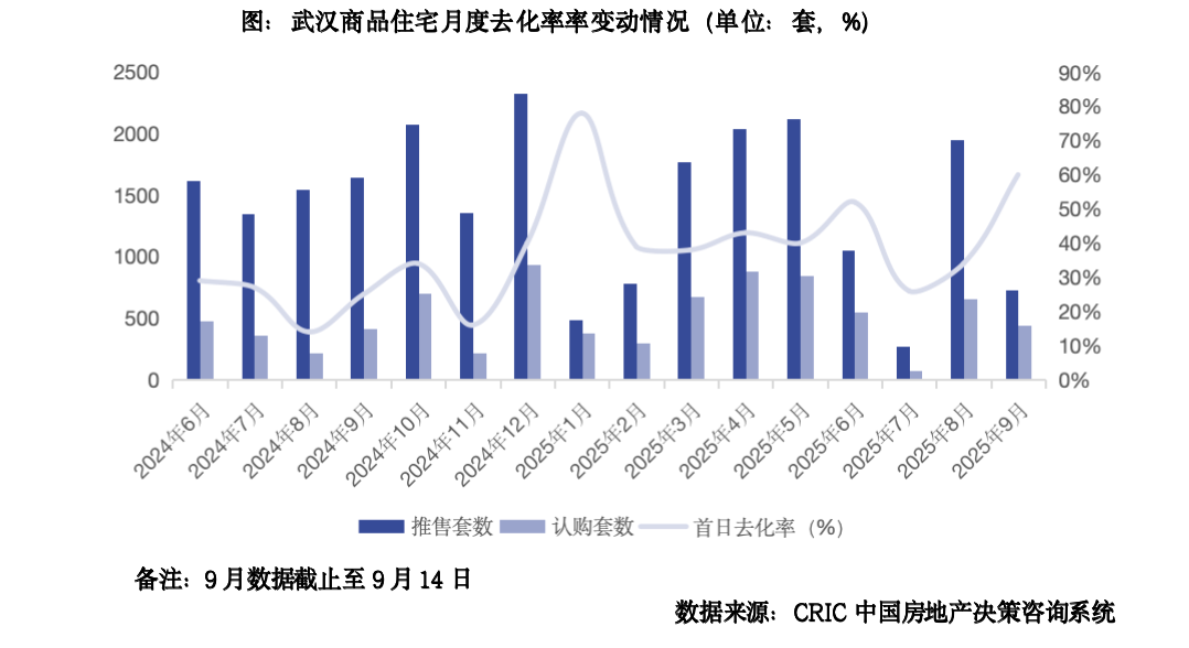 得益于适销对路楼盘集中入市,武汉9月以来项目开盘去化率持增,据CRIC监测数据,2025年9月前14日推盘套数仅734套,而8月全月推盘套数仅1950套;而从项目平均去化率来看,9月前14日稳中有增至60%,较7月全月34%增长26pcts。