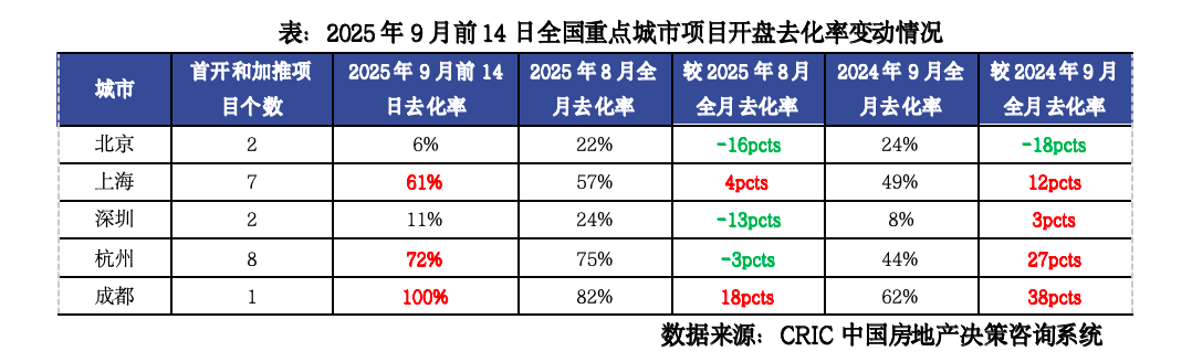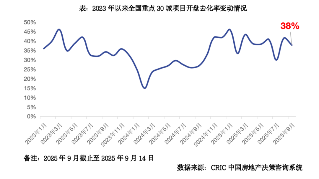 据CRIC监测数据,重点30城9月前14日成交面积达159.3万平方米,与去年同期下降6%。市场呈现出同比降幅放缓的弱复苏特征,从短期市场热度来看,9月市场热度延续高位:据CRIC监测数据,9月上半月重点30城项目开盘去化率为38%,较2025年8月全月微降4pcts,与2024年9月全月相比增长11pcts。