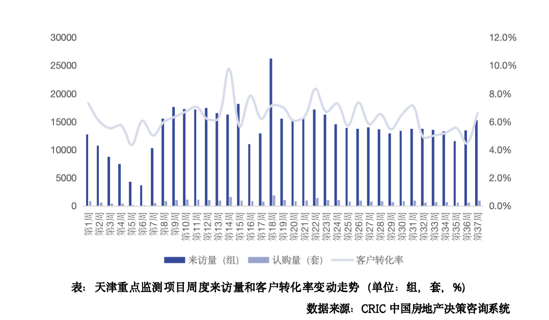 再如天津,9月第2周因新盘集中入市带动客户转化率走高。据CRIC监测数据,9月第2周红桥西站、生态城临海新城片区及生态岛3个新盘入市,分别带动市内六区和滨海新区成交环比上涨1.68倍、1.01倍,其他各区也有不同程度的走高。而从来访认购数据来看,第37周(9.8-9.14)全市来访15345组,单盘平均来访52组,环比上涨14%;认购1013套,单盘平均认购3.6套,环比上涨69%。客户转化率由4.4%增至6.6%。