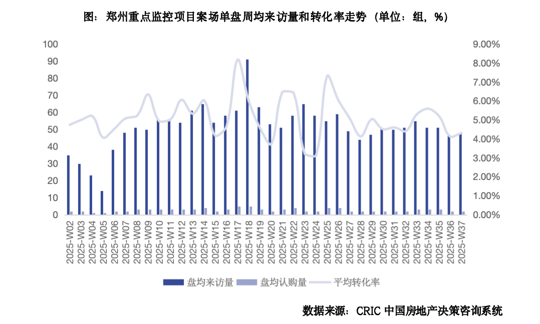 再如郑州,步入9月以来,重点监测楼盘盘均来访量、认购量均迎来小幅微降行情,第37周盘均来访量为48组,而盘均认购套数仅为2套,因而使得客户转化率维持4.31%低位波动。